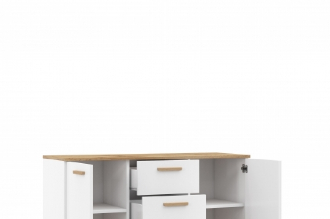 Komoda SCANDI została zaprojektowana z myślą o codziennym użytkowaniu. Oferuje pojemne wnętrze przy zachowaniu kompaktowych wymiarów. Dzięki temu idealnie sprawdzi się nawet w mniejszych przestrzeniach. Wyposażona została w:
