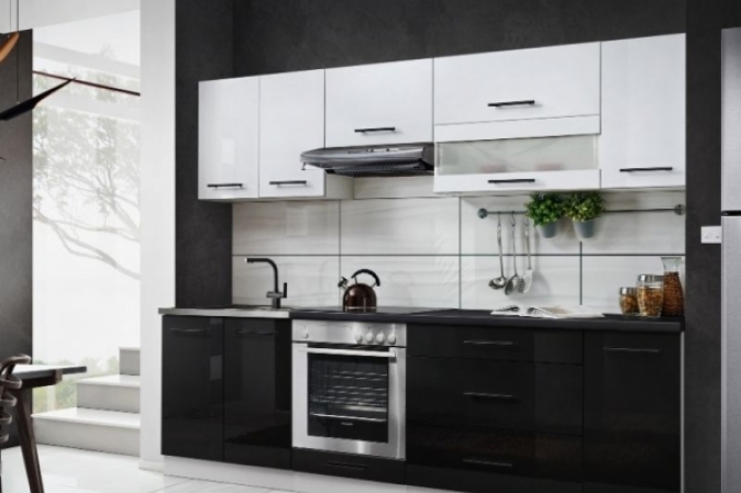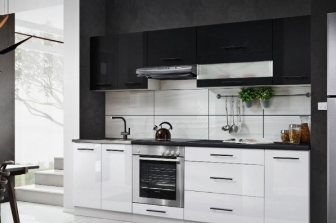 MEBLE KUCHENNE KUCHNIA CZARNY POŁYSK BIAŁY POŁYSK Z BLATEM ZESTAW SZAFKI 260CM MARCO