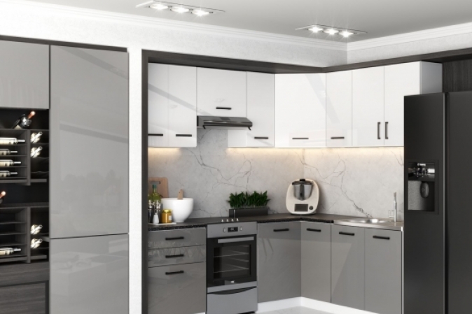 MEBLE KUCHENNE KUCHNIA ZESTAW SZAFKI KOLORADO NAROŻNA SZARY POŁYSK BIAŁY POŁYSK