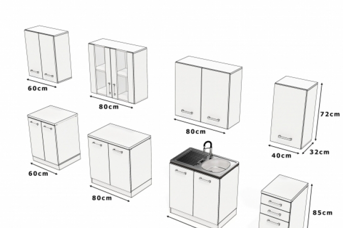 - górne szafki mają 60 cm wysokości i 32 cm głębokości